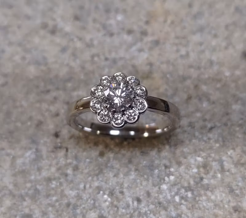 En bild är på en omarbetning där överdelen på en gammal ring fick flytta över till en annan ärvd slät ring.