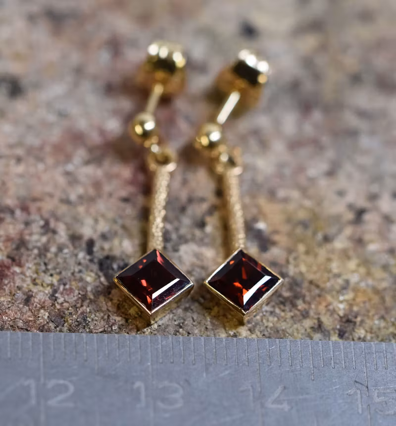 Handgjorda örhängen i 18 karat guld med röda granater 5x5 mm, egen design. Mekanik till örhängena är ej handgjorda.