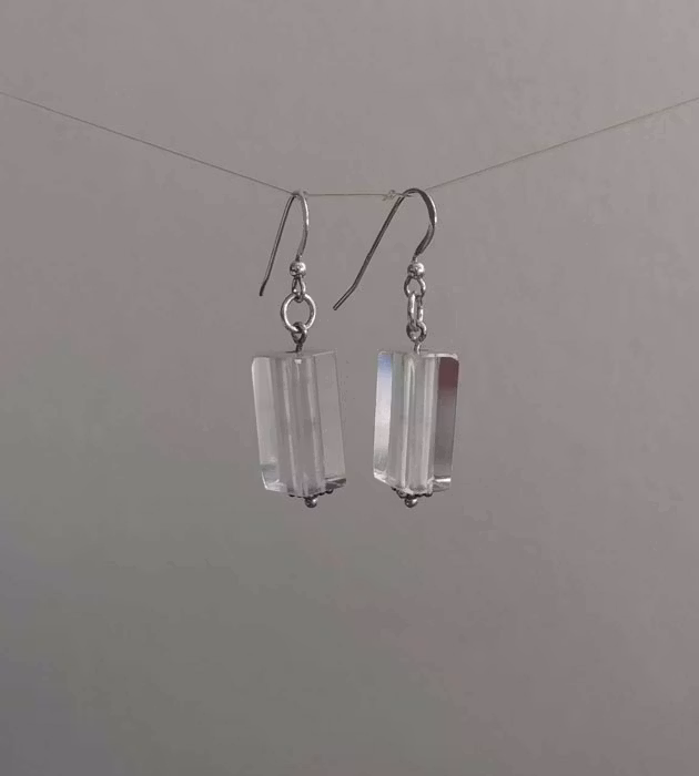 A) Ett par hängen för örhängen, silver och rektangulärt special slipad bergkristall 10x7,5 mm bred och 19 mm hög, total höjd 30 mm. Passar att hänga på de flesta örhängsmekaniker upp till en bredd på ca 2,5 mm. Krokmekaniken på bild ingår, annan örhängsmekanik köpes separat.