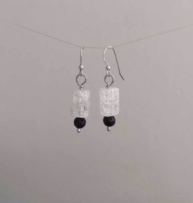 B) Ett par hängen för örhängen, silver och en tresidig slipad bergkristall 10 mm bred och 14 mm hög och svart lavakula 6 mm, total höjd 30 mm. Passar att hänga på de flesta örhängsmekaniker upp till en bredd på 2,5 mm. Krokmekaniken på bild ingår annan örhängsmekanik köpes separat.