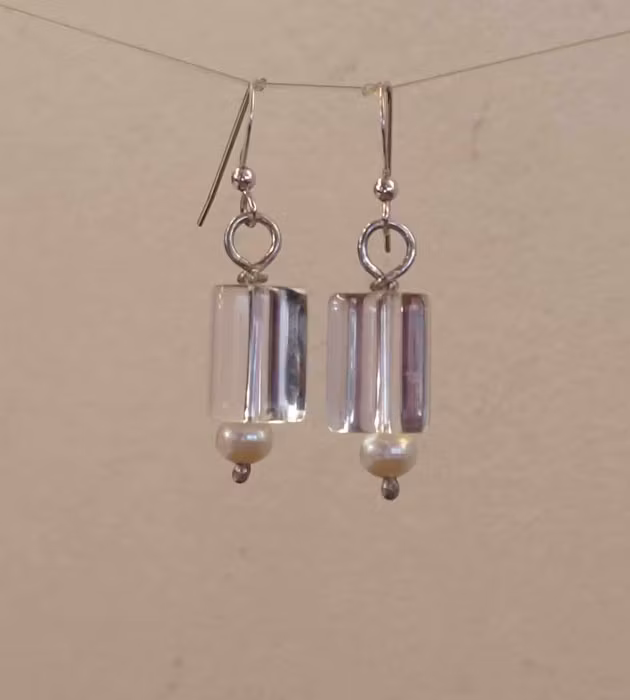 D) Ett par hängen för örhängen, silver och en tresidig slipad bergkristall 10 mm bred och 14 mm hög och en vit odlad sötvattenpärla 6 mm, total höjd 29 mm. Passar att hänga på de flesta örhängsmekaniker upp till en bredd på 2,5 mm. Krokmekaniken på bild ingår, annan örhängsmekanik köpes separat.