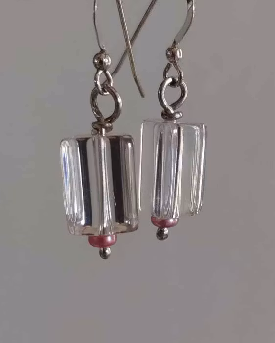 G) Ett par hängen för örhängen, silver och en tresidig slipad bergkristall 10 mm bred och 14 mm hög och en liten rosa odlad sötvattenpärla 4 mm, total höjd 25 mm. Passar att hänga på de flesta örhängsmekaniker upp till en bredd på 2,5 mm. Krokmekaniken på bild ingår, annan örhängsmekanik köpes separat.
